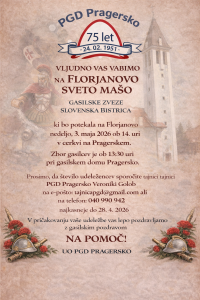 PGD Pragersko vabi na Florjanovo mašo GZ Slovenska Bistrica, ki vo 3. 5. 2026, ob 14.uri v cerkvi na Pragerskem. Zbor gasilcev ob 13:30 uri.